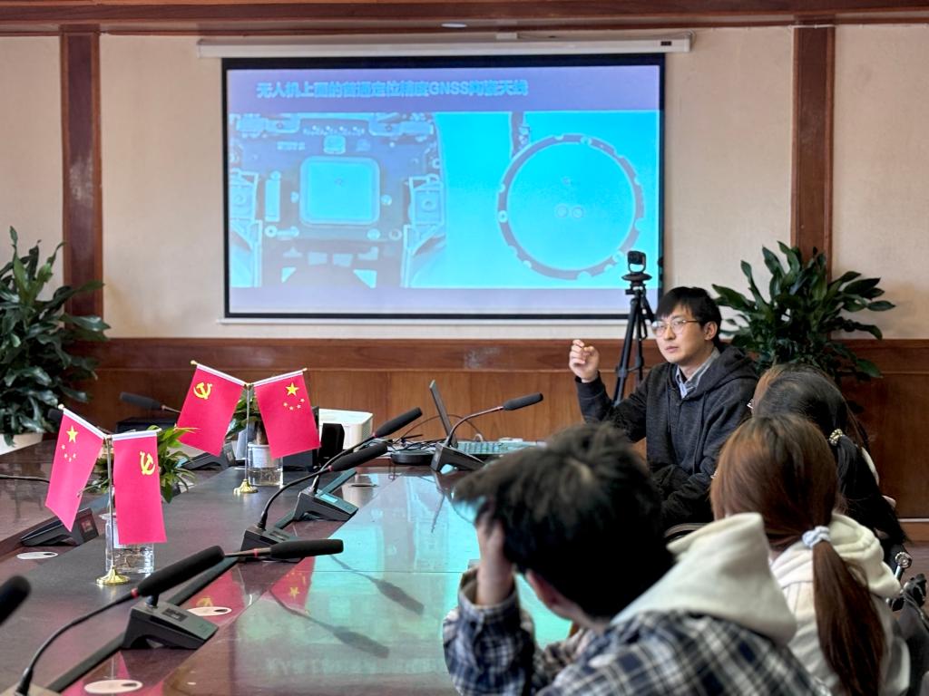交流会中,徐崧原博士提到:面对低空经济蓬勃发展所带来的人才挑战,我们应该通过深度融合理论学习、真机实训与产业项目,打破学科壁垒,构建一个学训创一体化的育人新模式;徐博士还结合自己的研究方向,用通俗的语言为同学们解析了无人机的两项关键技术:一是GNSS导航天线如何像“空中指南针”一样,为无人机提供稳定精准的定位;二是小巧高效的通信天线,又如何确保飞行数据能够实时、可靠地传输。他还简要介绍了这些天线技术在信号接收与抗干扰方面的最新进展。在互动环节,徐博士耐心解答了同学们关于无人机空间定位、GNSS系统保障通讯等方面的疑问,并鼓励大家在科研中勇于探索、善于积累。